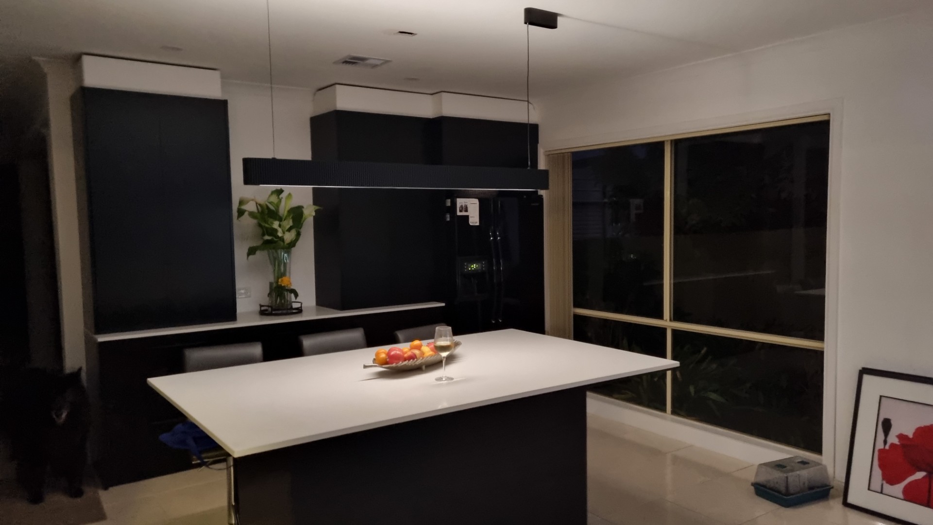 Sleek pendant light installation over kitchen island — modern feature lighting with dimmer control.