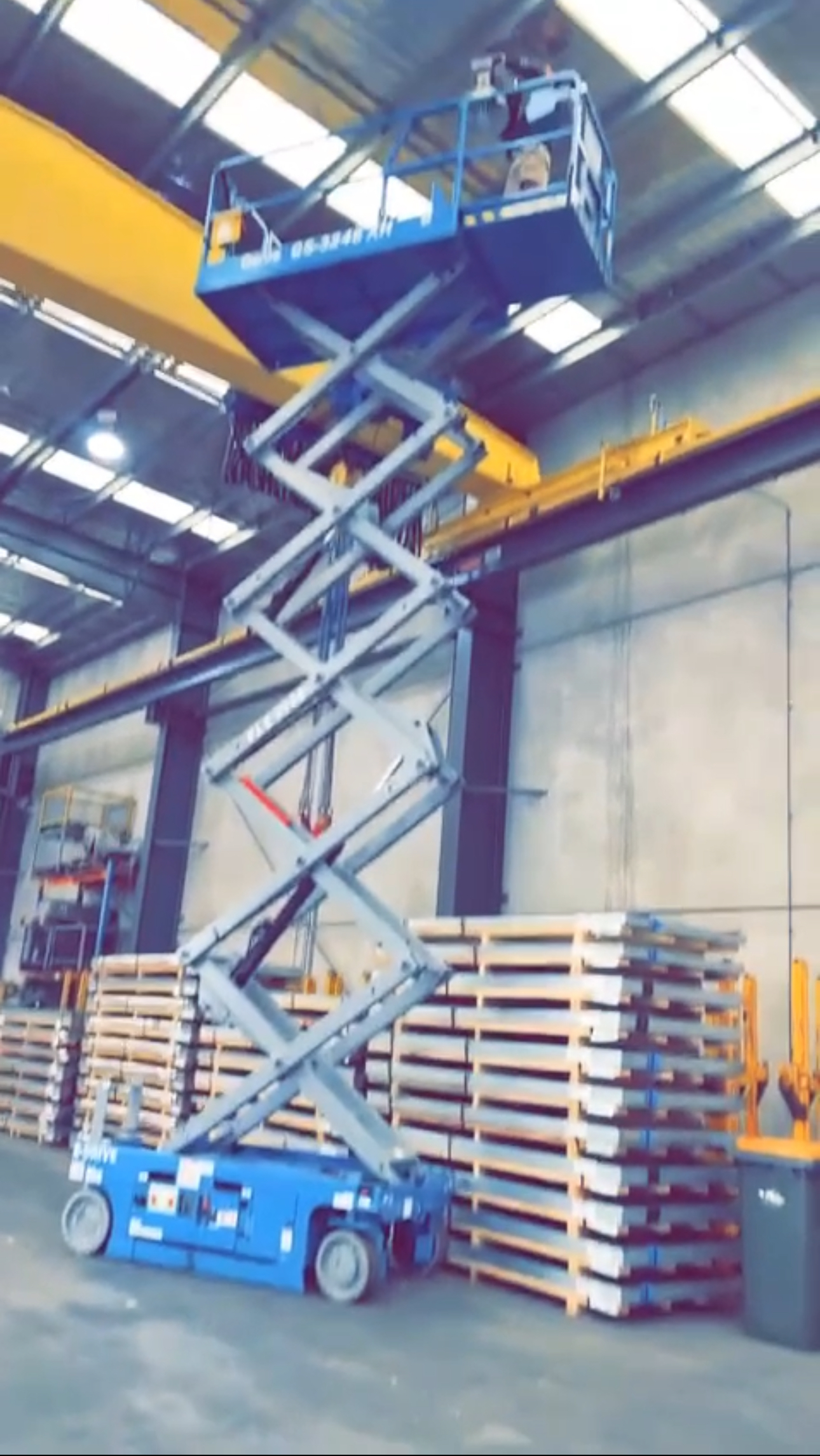 High-level electrical installation in industrial warehouse using scissor lift — lighting and power distribution.